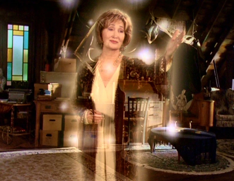 In order to prepare for Piper's wedding, Penny was summoned and assisted Prue and Phoebe decorate the Manor.[10] While summoned Penny instructs Piper to keep the Halliwell last name rather than take Leo's telling her that the women in the Halliwell family always keep their own last name.