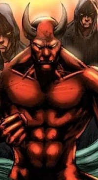 The Red Skinned Devil is a demon with devilish horns a top it's forehead and yellow eyes, this evil being has a muscular upper body that matched a regular human being but it had the lower body reminiscent of legs found on a hoofed animal; he also had a short tail.