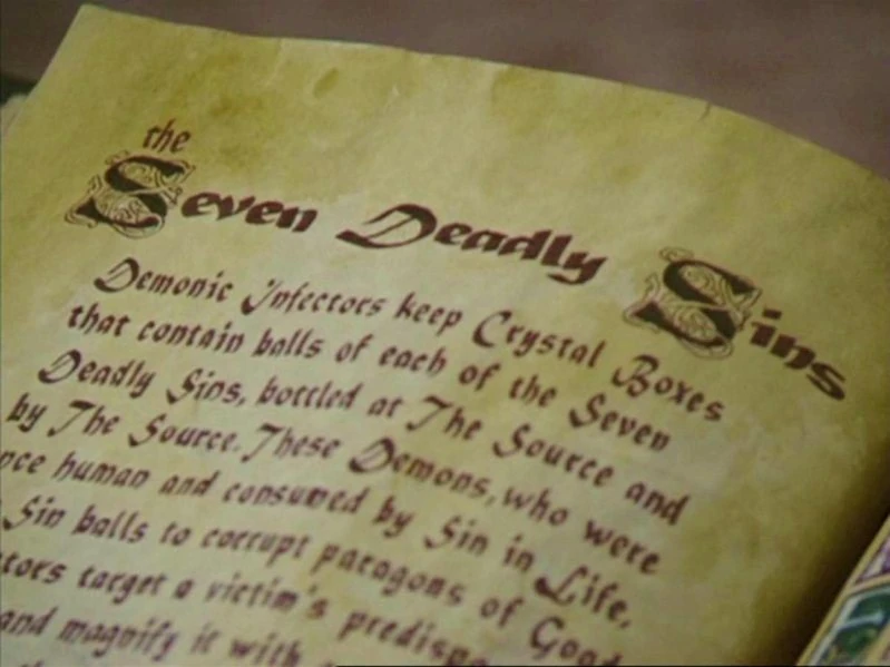 In the Attic of Halliwell Manor, the sisters found an two page entry on the Sins emphasized by an explanation of the Sins, the Demonic Infectors and an illustration of a large open Crystal Box exposing the seven balls of Sin. The entry read thus:
