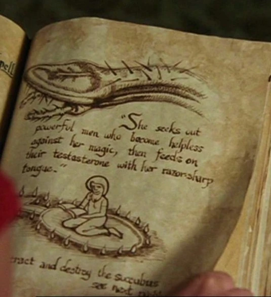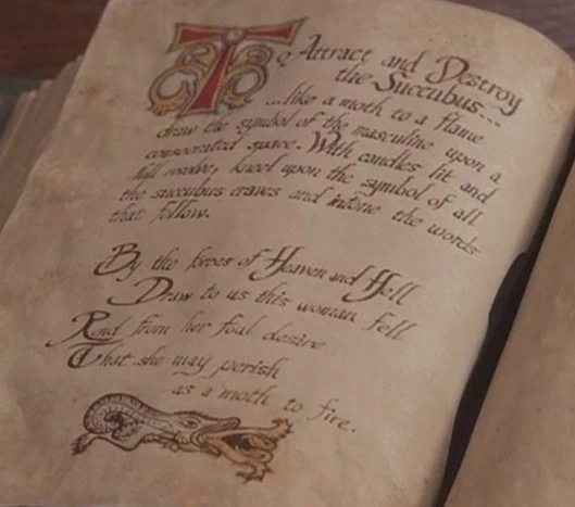 Piper located an entry on The Succubus in the Book of Shadows containing a two page spread of information regarding the evil being. The entry was emphasized by a drawing of a Succubus' tongue. On the back of the two-page spread was a spell to Attract and Destroy her.